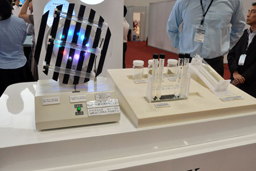 現(xiàn)代工業(yè)社會的生產(chǎn)活動中,一大污染源就是工業(yè)廢水,目前限行的主要處理辦法是在工業(yè)廢水中加入化學(xué)藥劑,使之分解達到凈化目的。索尼在此次展會上展出了基于有機技術(shù)的新型工業(yè)污水處理技術(shù)。筆者在現(xiàn)場看到加入索尼的凈化材料后,工業(yè)廢水中的污染物會附著沉淀,處理后的水質(zhì)明顯改善,據(jù)現(xiàn)場人員介紹已經(jīng)達到相關(guān)的排放標準,可以直接排放,不會造成環(huán)境污染。