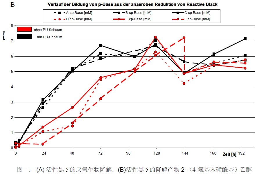 圖B 顯示的是活性黑5 的降解產(chǎn)物2-(4-氨基苯磺;┮掖嫉臐舛茸兓闆r。黑色曲線是使用LEVAPOR 生物膜技術(shù),紅色曲線是使用活性污泥法的該物質(zhì)的濃度變化趨勢圖。使用LEVAPOR 生物膜技術(shù)2-(4-氨基苯磺;┮掖嫉臐舛仍48 小時(shí)達(dá)到5mM,而使用普通活性污泥達(dá)到同樣的濃度則需要96 小時(shí)。