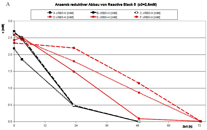 在該項(xiàng)目中對使用普通的活性污泥法和LEVPAOR 生物膜技術(shù)做了定量的分析。通過使用HPLC-DAD 檢測技術(shù)對染料物質(zhì)活性黑5 的去除過程做了分析,見圖一。圖A 中是活性黑5 的濃度隨時(shí)間的變化情況。黑色曲線是使用LEVAPOR 生物膜技術(shù),紅色曲線是使用活性污泥法的該偶氮類物質(zhì)的濃度變化趨勢圖。從中可以觀察到使用LEVAPOR 生物膜技術(shù)48 小時(shí)后活性黑5 能徹底降解,而使用活性污泥法需要72 小時(shí)活性黑5 的濃度才趨近于零。