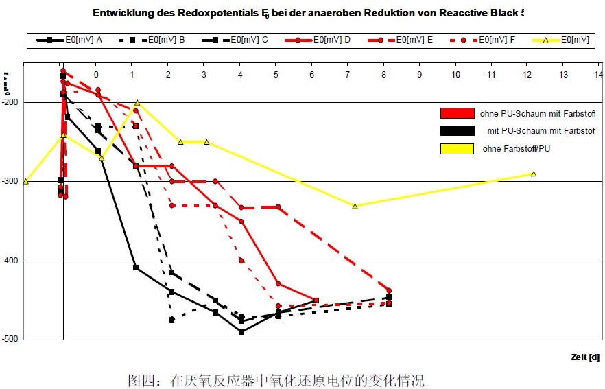 使用LEVPAOR 生物膜技術(shù)偶氮類物質(zhì)的降解速度和氧化還原電位的減少速度更快表明其中存在一定的關(guān)聯(lián)。偶氮類物質(zhì)的降解是因?yàn)榕嫉鶊F(tuán)被還原為氨基,從而電位降低。