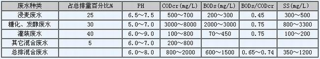 目前我國啤酒生產(chǎn)廢水主要來自麥芽車間。有浸麥廢水;糖化工段的糖化、過濾和洗滌廢水,發(fā)酵工段的發(fā)酵廢液和洗槽廢水,灌裝車間的洗瓶水、滅菌用水及瓶破碎時渣出的少量啤酒,其它廢水包括冷卻水,地面沖洗水等。各股廢水的污染物濃度詳見表1。