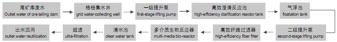 針對此類水水質(zhì)特點并結(jié)合我公司多年來從事水處理工程的設(shè)計、運行管理經(jīng)驗,我公司認為尾礦庫出水中COD濃度的60%~70%都來源于懸浮顆粒物及膠體類物質(zhì)等,為了確保出水水質(zhì),去除尾礦庫出水中懸浮物是非常必要的。尾礦庫廢水處理工藝的關(guān)鍵點為:通過可靠、穩(wěn)定的物化主體處理工藝去除污水中的懸浮物,同時可有效降低COD的含量。再輔以生化深度處理工藝去除未被降解的有機物,確保出水達標,同時為污水的回用創(chuàng)造良好的水質(zhì)條件。
