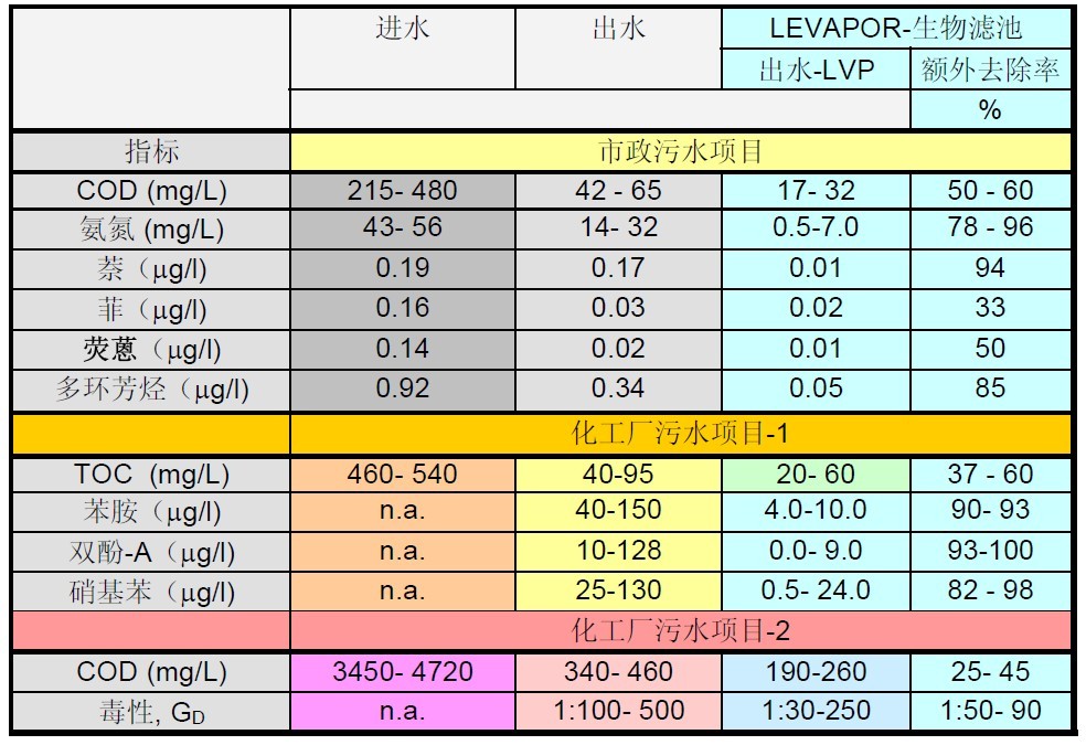 以下表格顯示的是在生物濾池中使用LEVAPOR 生物膜技術(shù)對不同類型污水的處理效果分析。從圖表中可以看出無論是市政項(xiàng)目還是工業(yè)項(xiàng)目使用 LEVAPOR 生物濾池后對各種類型的污染物去除率均很高。