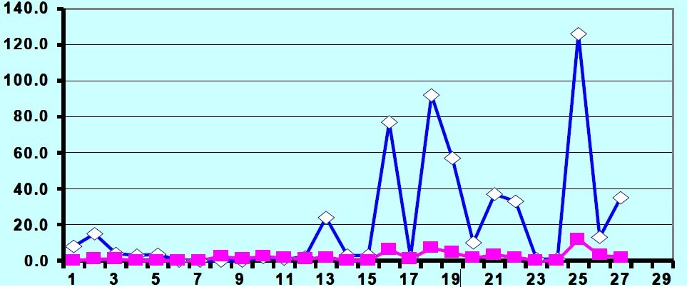下面這張圖顯示的是使用LEVAPOR 生物濾池中降解雙酚-A(BPA)的效果分析,其中藍(lán)色表示進(jìn)水,紅色表示出水,橫軸是時間(天),縱軸是濃度。