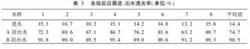由表可知, A 段出水平均透光率74. 7%, 由于水中懸浮固體大幅度的去除和缺氧環(huán)境下某些有色官能團(tuán)的轉(zhuǎn)化, 使透光率增加60. 3 %. AB 工藝出水總平均透光率達(dá)到90.5%, 這表明A 具有對(duì)水中懸浮固體的高效去除及轉(zhuǎn)化大分子有機(jī)物為小分子有機(jī)物的功能, 使進(jìn)水符合B 段對(duì)水質(zhì)的要求, 從而使AB 工藝最終出水清亮透明, SS 含量非常低, 由此可見(jiàn)影響透光率的主要因素是水中的SS 和有色物質(zhì).