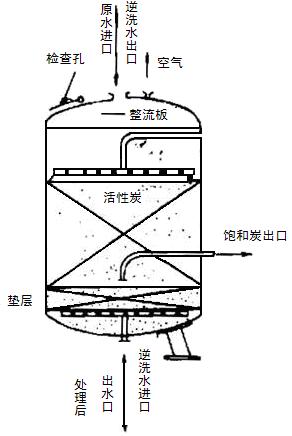 這種操作方式是原水與吸附劑逆流接觸,處理水由塔頂流出,再生后的再生劑由塔頂加入。飽和的吸附劑間歇從塔底排出。進(jìn)水;2、移動(dòng)床;3、出水;4、輸炭管;5、新炭貯槽;6、飽和炭貯槽;7、脫水格網(wǎng);8、再生爐;9、再生炭;10、再生炭貯槽;11、空壓機(jī);12、飽和炭這種方式可連續(xù)進(jìn)行,適用于較大規(guī)模的廢水處理。