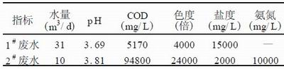 江蘇省某顏料化工廠的產(chǎn)品主要利用三氯乙烯、氯仿、三乙胺、甲醛、三氯化鋁等多種無機(jī)和有機(jī)物為原料來生產(chǎn)多種化工顏料,生產(chǎn)過程中產(chǎn)生大量的有機(jī)酸性廢水,廢水成分復(fù)雜,高氨氮、高鹽度、高色度、 COD 值高,可生化性差,其水質(zhì)和水量如表1 所示。