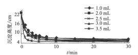由圖4可以看出,當(dāng)加入質(zhì)量濃度為0.5g/L的PAM3.5mL時(shí),沉淀百降最快,且最終沉淀高度最低。但在試驗(yàn)過程中觀察其沉降過程,其生成的絮狀體易破碎,致使有